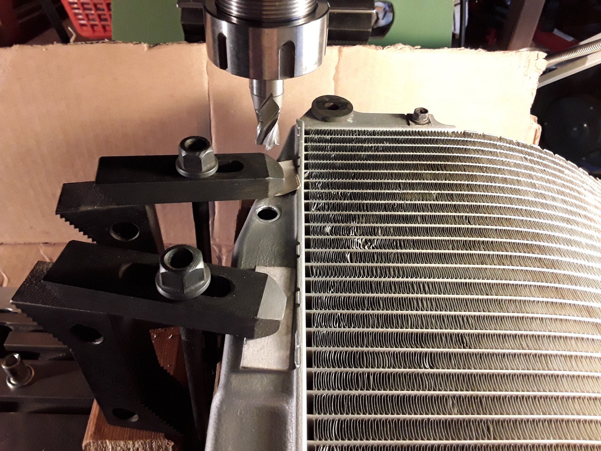 Vom Kühlkreislauf kamen 2 Probleme: Das Kühlmittel war vollständig verdunstet und hat an bestimmten Stellen eine feste Masse zurück gelassen, die nicht einfach wieder aufzulösen war. Außerdem hat es an einigen Stellen auch an Alu zu Korrosion geführt. Betroffen war zB der Schlauchanschluss am Kühler rechts, der zum Öhlkühler führt. Er ist beim Schlauchabziehen ohne großen Widerstand gebrochen.