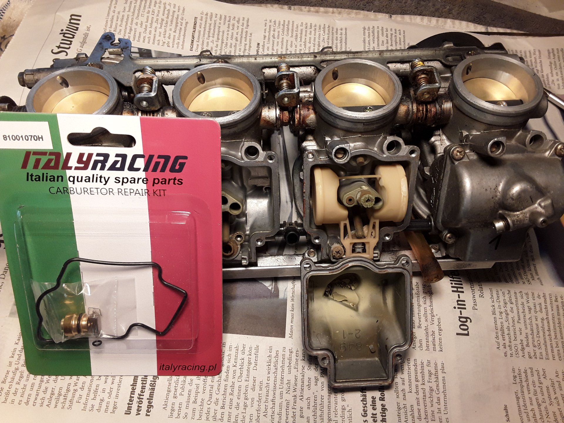 Die Vergaser waren innen auch nicht mehr so toll, aber nicht so schlimm wie befürchtet. Ablagerungen in der Schwimmerkammer und auf den Messingteilen und leichte Korrosion der Schrauben.