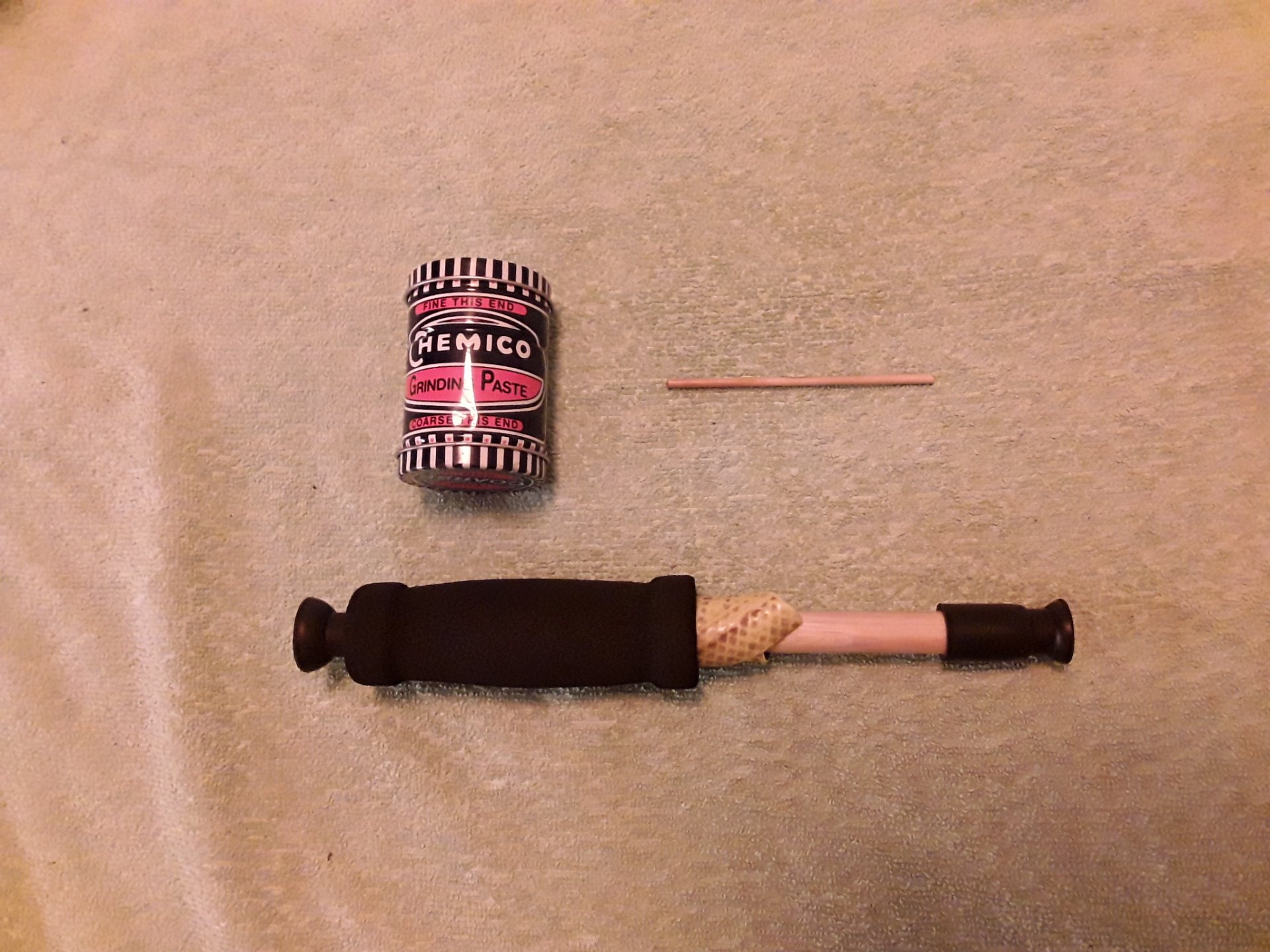 Alter Fahrradgriff auf dem Läppwerkzeug. Jedes Ventil hat bestimmt 10-15 min gedauert, manche sogar mehr mit sauber machen und fein nachläppen.