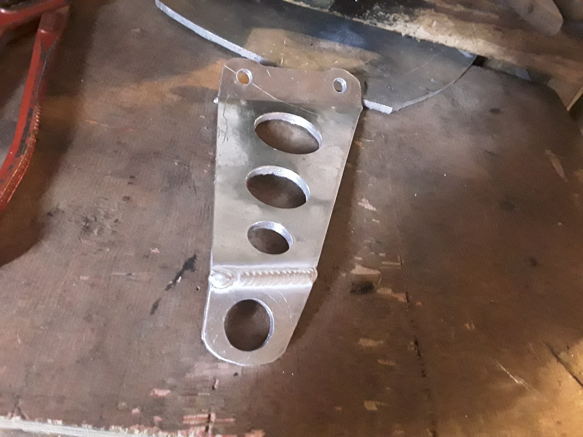Alu Riffelblech, ca 5-6mm. Die Biegekanten mittels Trennscheibe etwa zu 3/4 eingeschlitzt, um auch im Schraubstock sauber hiegen zu können. Die Löcher mittels Lochsägen. Hatte nicht die perfekte Durchmesserabstufung, aber geht.