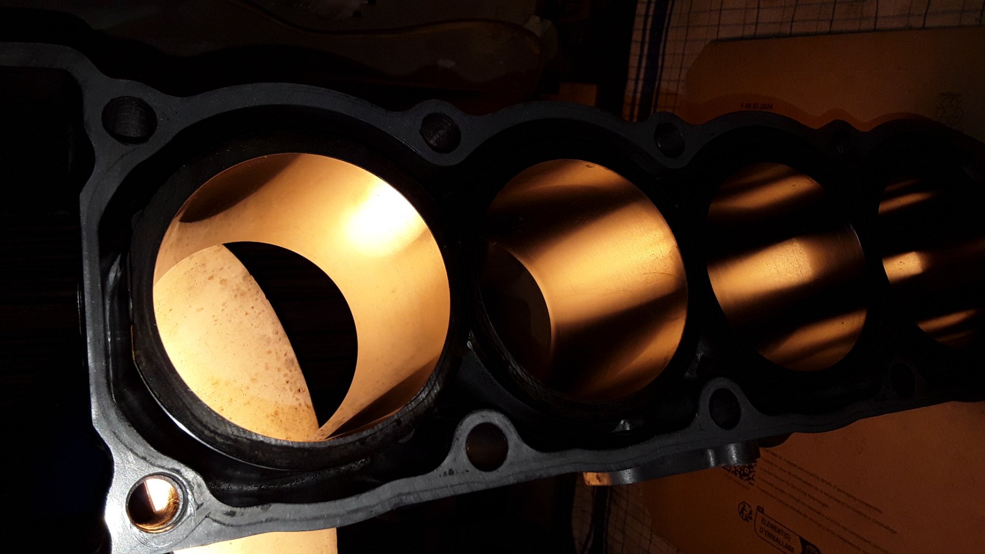 Die Zylinder sind auf 72,98 Durchmesser gehont, da meine Kolben 72,93 haben. So ergibt sich knapp das kleinste zulässige Laufspiel für maximale Lebensdauer und geringstes Kolbenkippen. So jedenfalls der Plan haha.