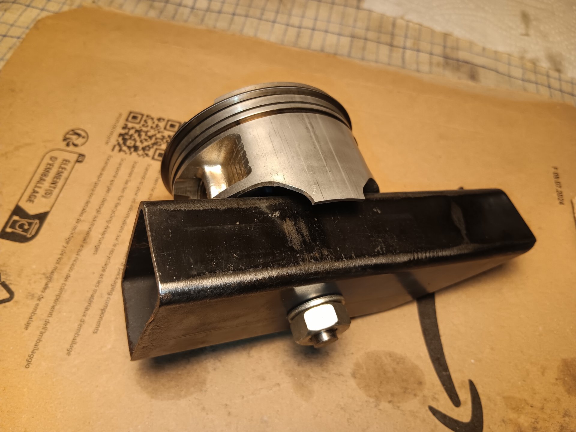 Professionelle Spannvorrichtungen drücken den Kolben über den Bolzen gegen ein Prisma. Nur einseitig, da der Kolben so kegelförmig ist. Hatte erst 2 Prismen im Schraubstock probiert, ist aber zuviel zum Ausgleichen.