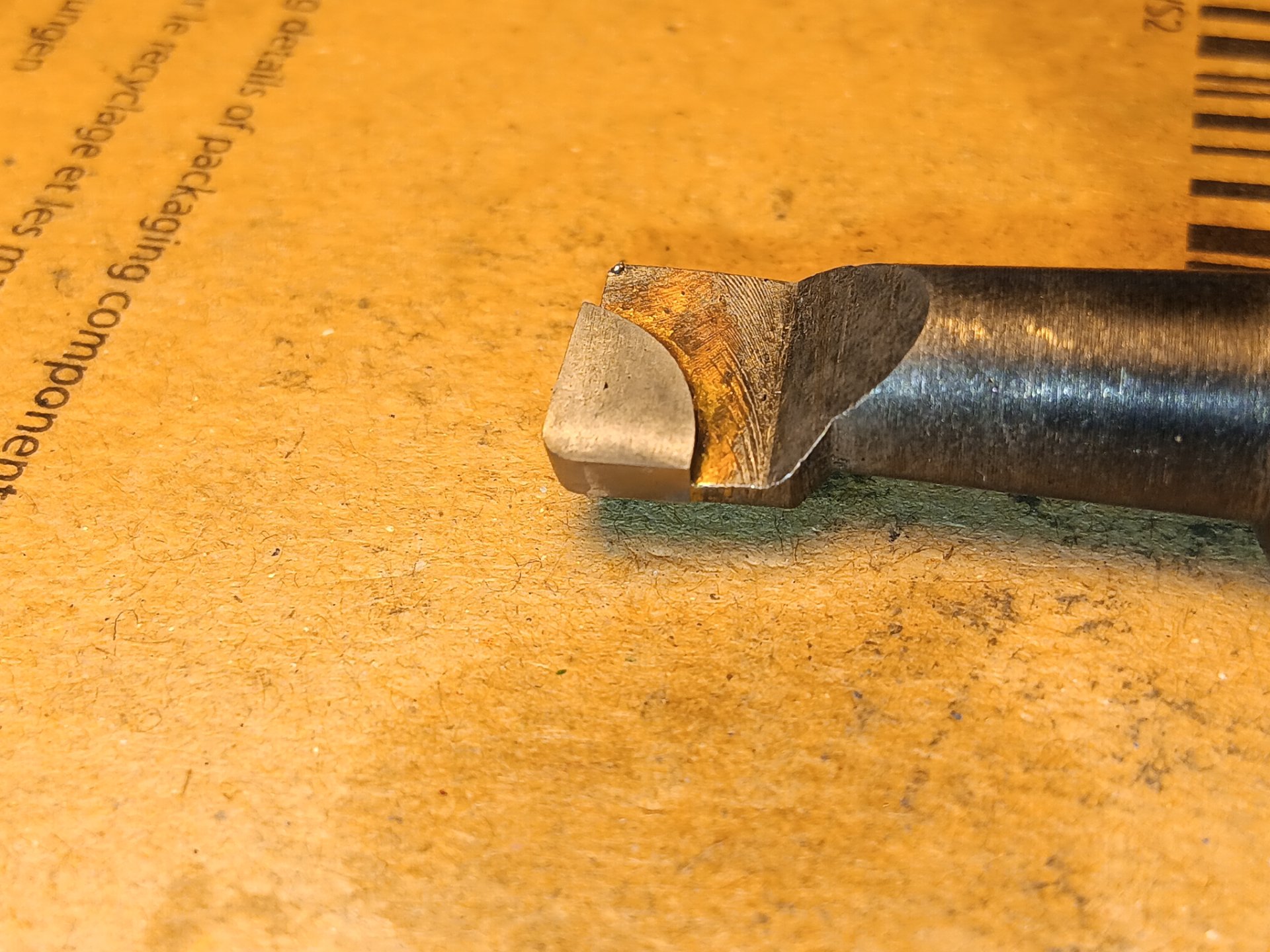 Es ist ein 0815 Bohrkopf mit selbstgemachter Verlängerung, um bis nach unten zu kommen. Werkzeug ist passend gedrehtes Stück Stahl mit aufgelöteter Hm Platte.