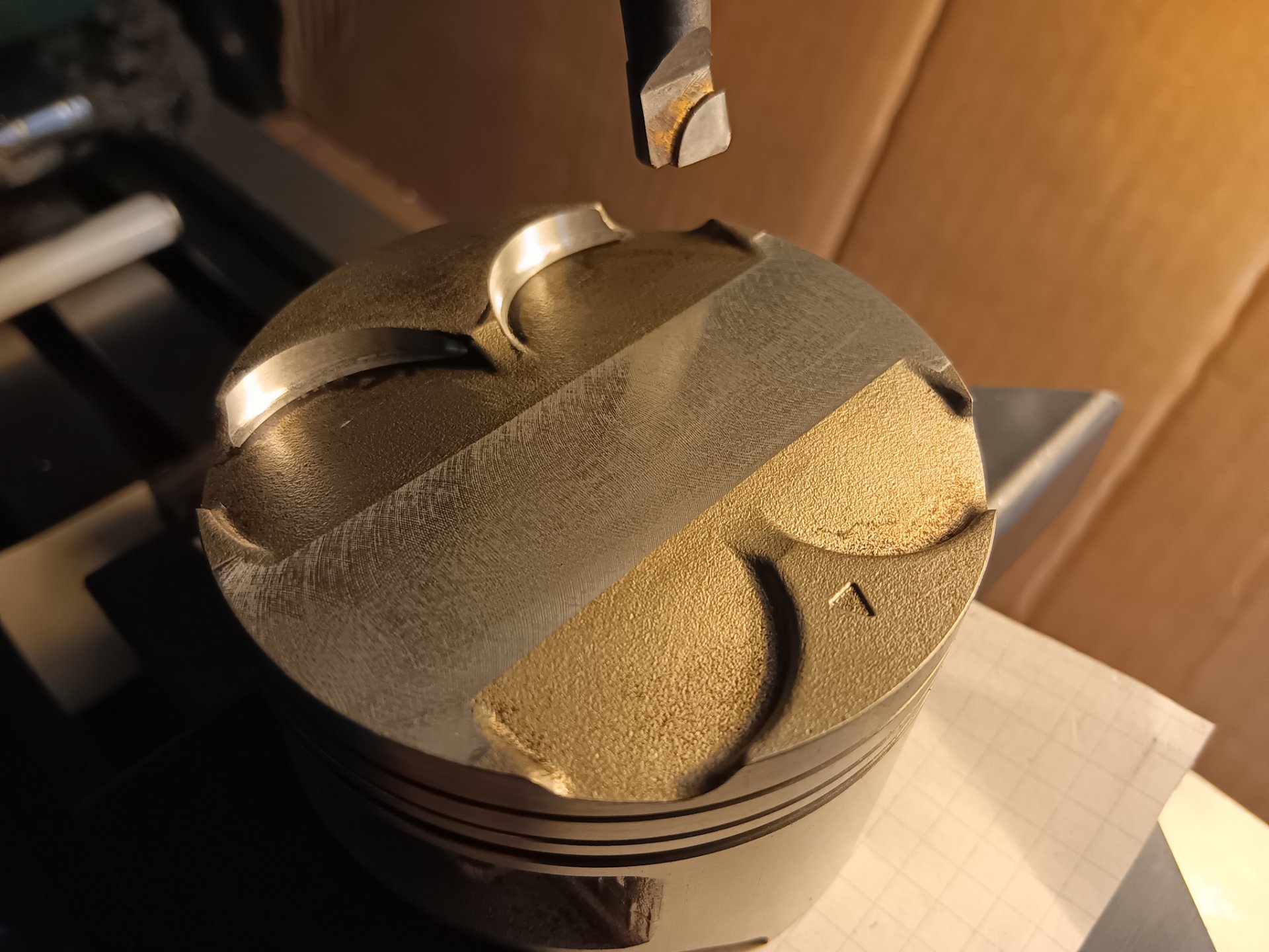 So wird der gesamte Kolbenboden abgesehen von den Taschen gleich hoch. Dadurch ringsherum die gleiche Quetschkante. Es sind ungefähr 35/100 runter.