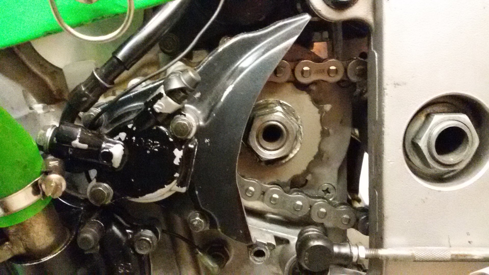 Habe eine größere Ritzelabdeckung. Nun wird das Kettenfett nicht mehr gegen Anlasser und Motorblock geschleudert.