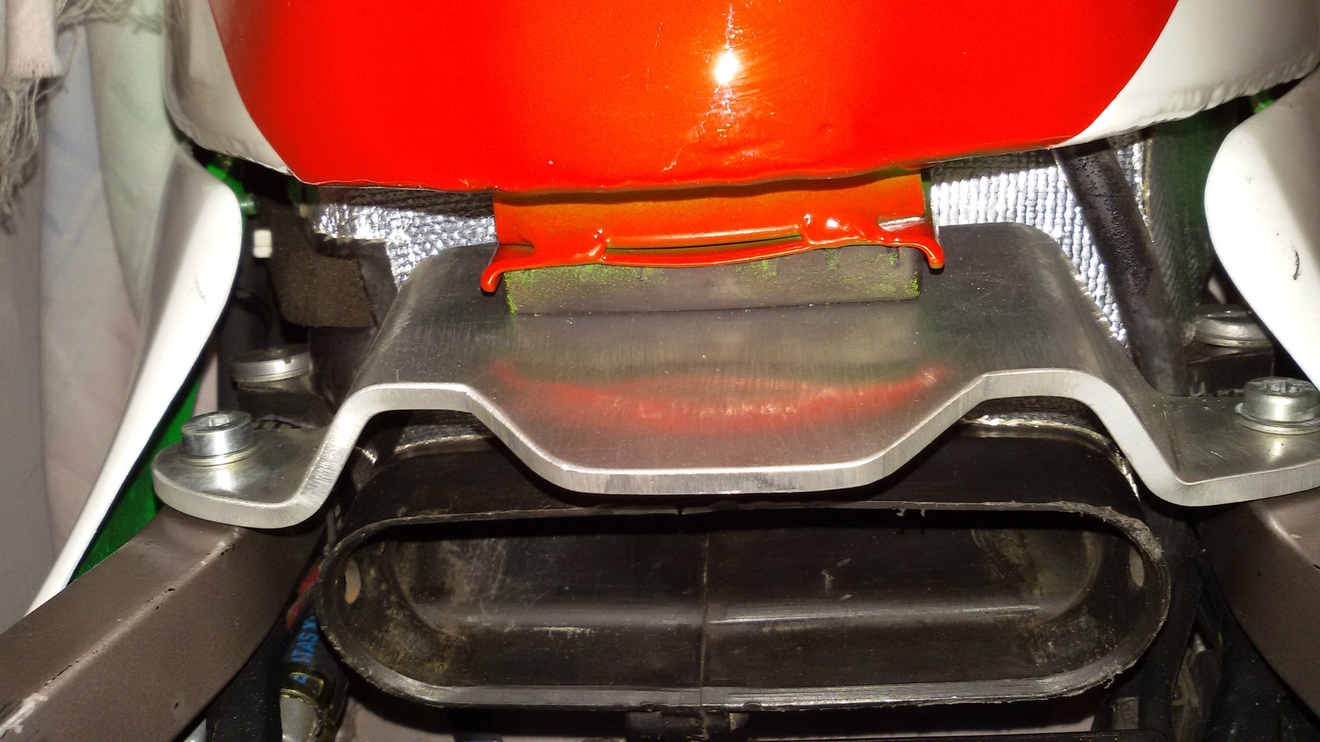 Die Matte deckt seitlich nur noch den Motor ab und lässt die Hitze jetzt seitlich zwischen Rahmen und Motor entweichen.