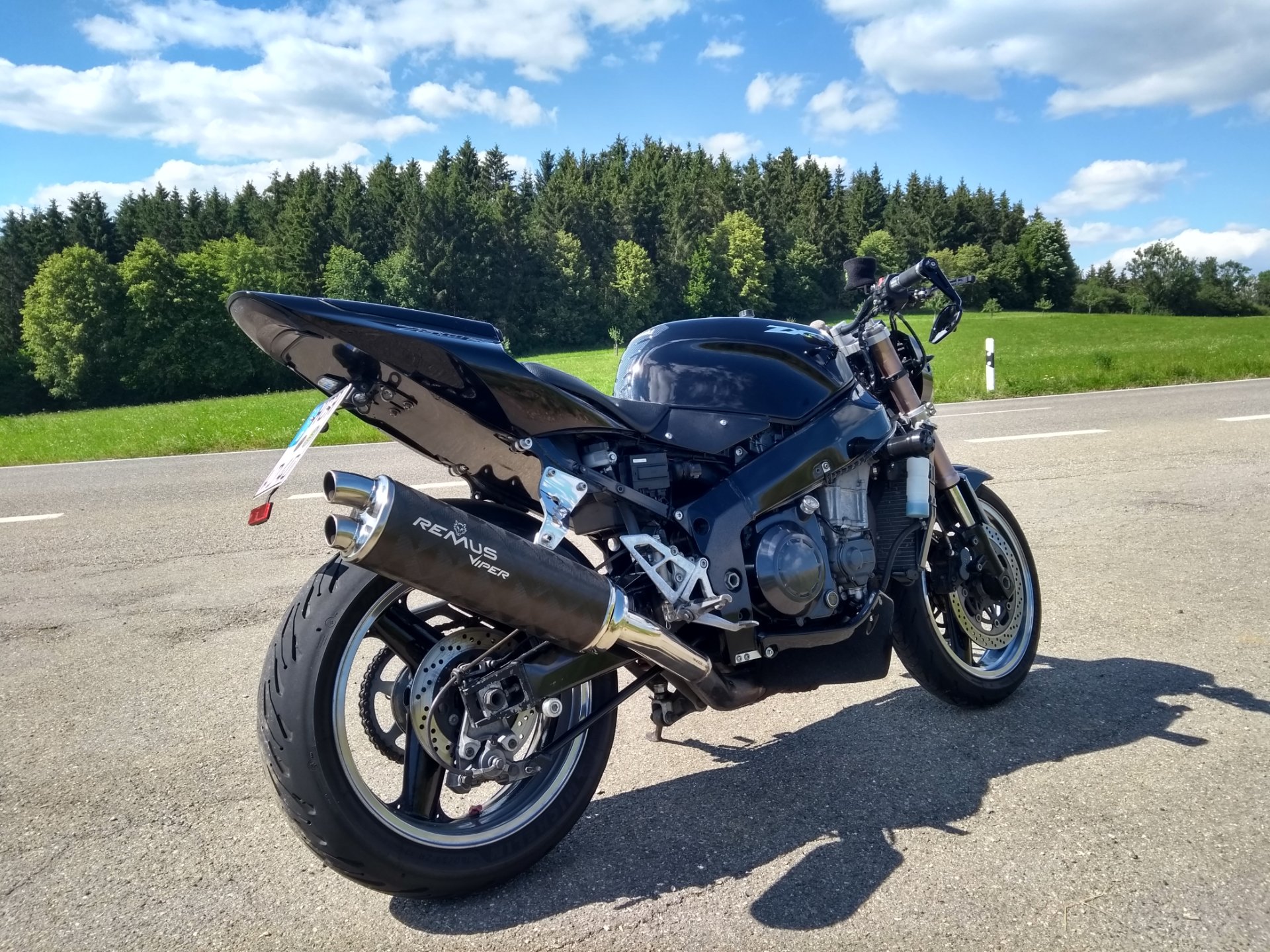 An dieser Stelle nochmals vielen Dank an Tie, der mir diesen wunderschönen Remus-Topf und die EBC-Bremsscheibe für die Hinterradfelge veräußert hat :prost: