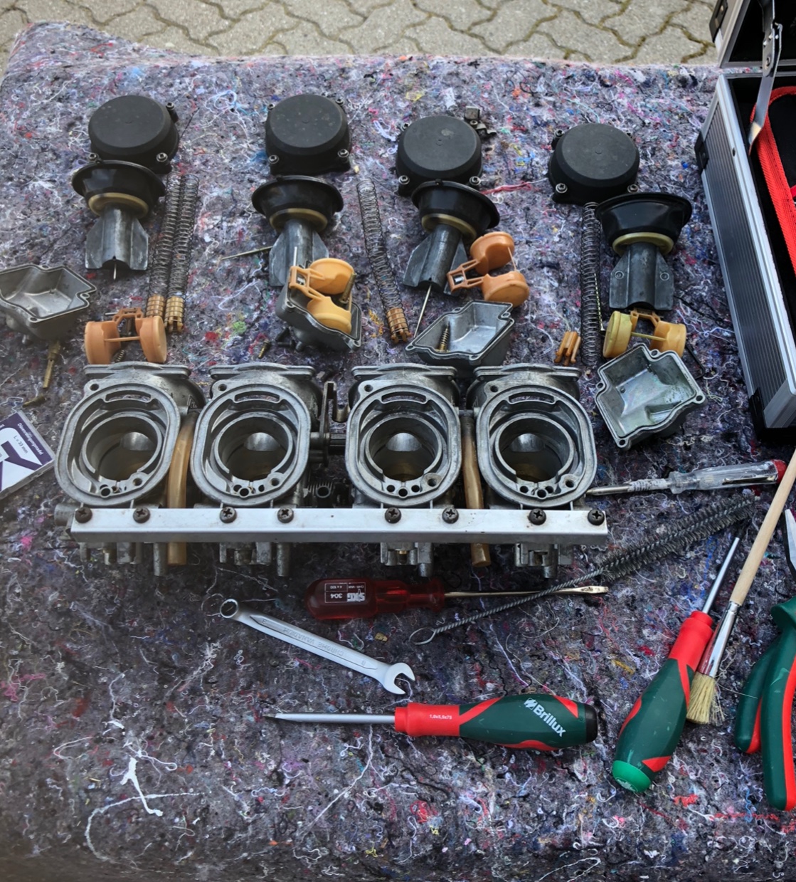 Es geht in ganz kleinen Schritten vorran. Nach viel Gebastel, unzähligen Vergaser raus und rein laufen nun zumindest alle 4 zylinder. Immer wenn eine Sachen an dem Gaser mehr funktioniert, ploppt was anderes auf. Mal läuft eine Kammer über, dann geht ein membran nicht hoch… ich glaub ich bau wieder auf Spritze um