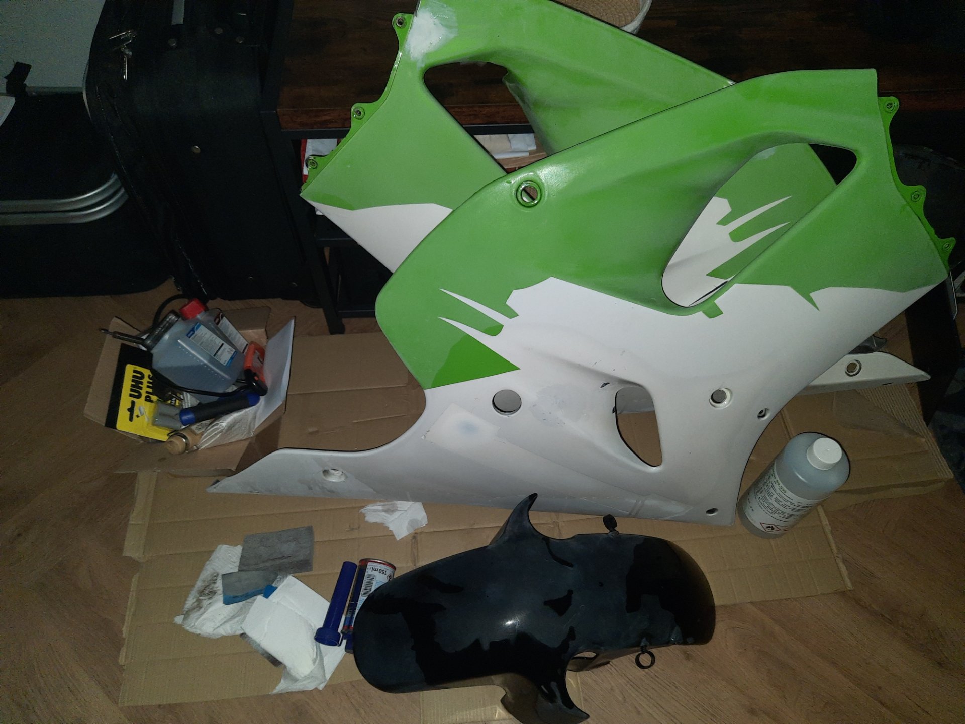 Der Tank geht nun zum Entlacken und Entrosten von außen. Die Verkleidungsteile werden nun fürs Lackieren vorbereitet.