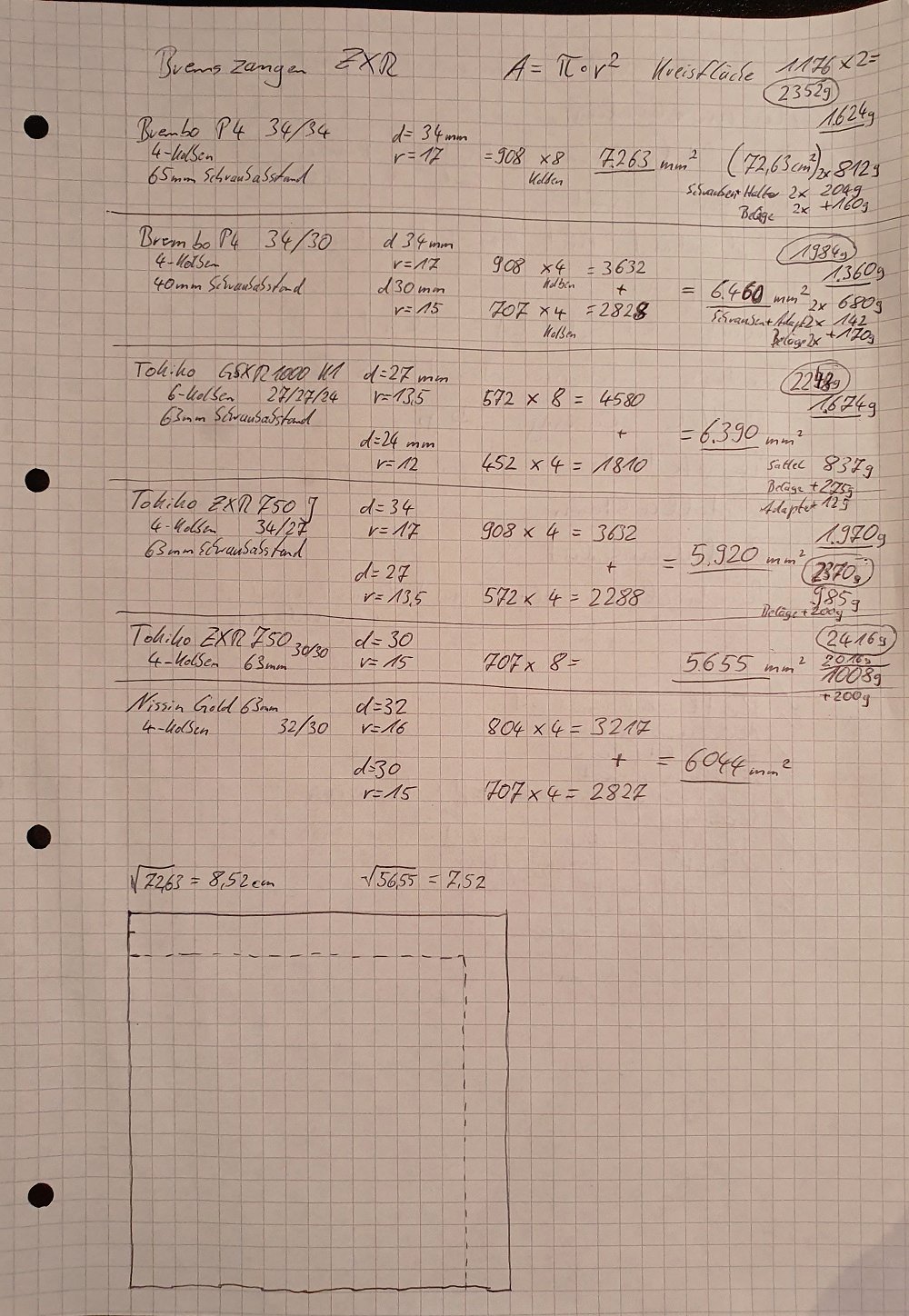 Aus diesem Grund habe ich von allen Bremssätteln die Kolbendurchmesser aufgeschrieben um die "Hydraulische Fläche" der Bremszangen zu vergleichen.