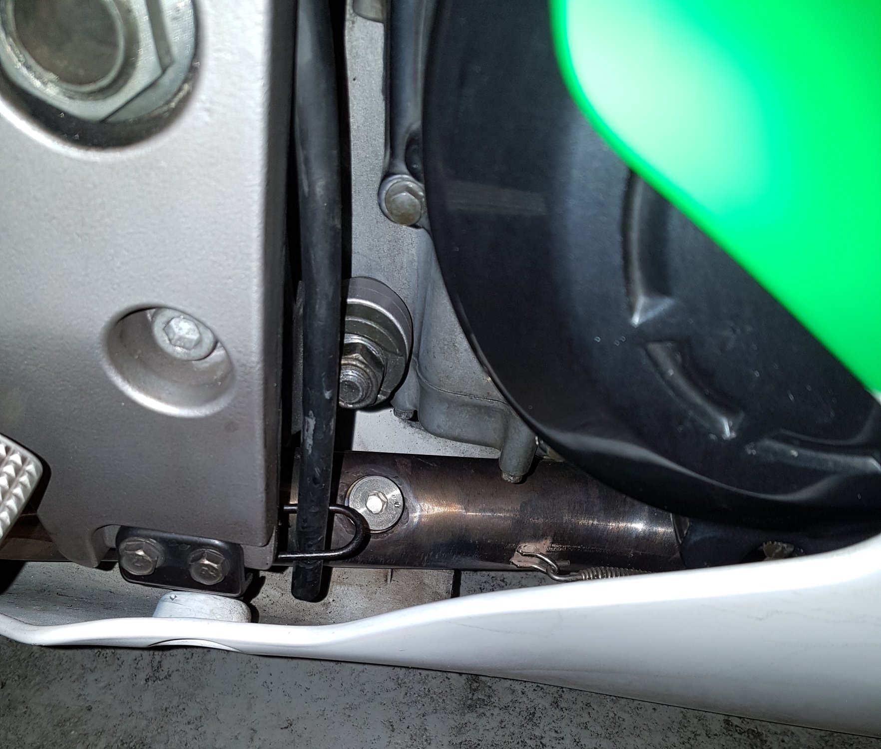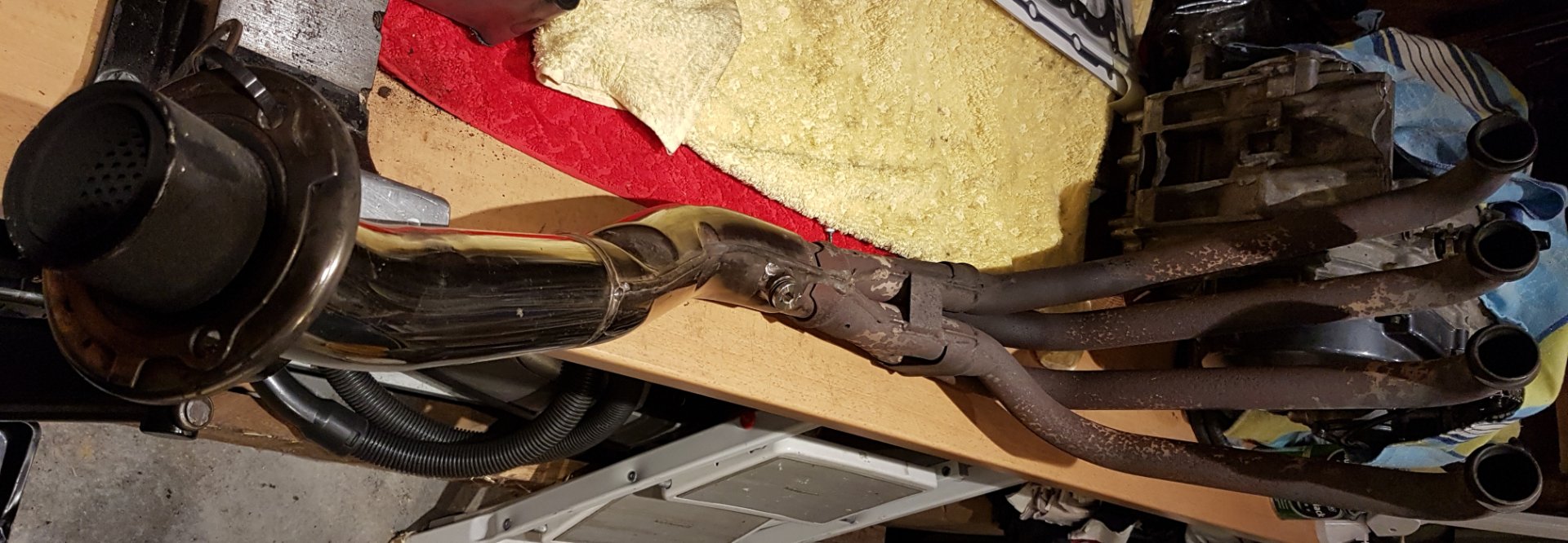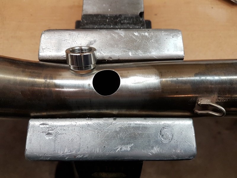Die Stelle im Krümmer ist direkt hinter der Zusammenführung. Das Hauptrohr scheint durchgehend doppelwandig zu sein (Innenrohr ist gelocht). Das dritte Blech scheint ein mittig eingeschweißtes Leitblech zu sein. Etwas weiter hinten ist der Rahmen die Federbeinumlenkung und die Schwinge/ Bremssattelstütze... die ausgesuchte Stelle ist für mich die Sinnvollste. Je weiter Richtung Brennraum desto besser. An der Stelle kommt man problemlos ran ohne das Moped zu zerlegen und die Sonde bekommt kein Kondens- oder Waschwasser ab. Die doch recht Lange LSU4.9 ragt dann mit dem Kabel zwischen Hauptrahmen und Kupplungsdeckel nach oben.