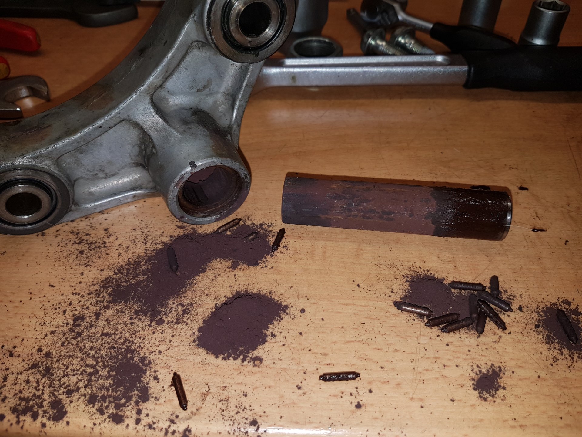 Leider hat sich dabei ein Mitnehmerzahn im Getriebe verabschiedet und das Motorgehäuse vor der Schwinge auseinander gedrückt.