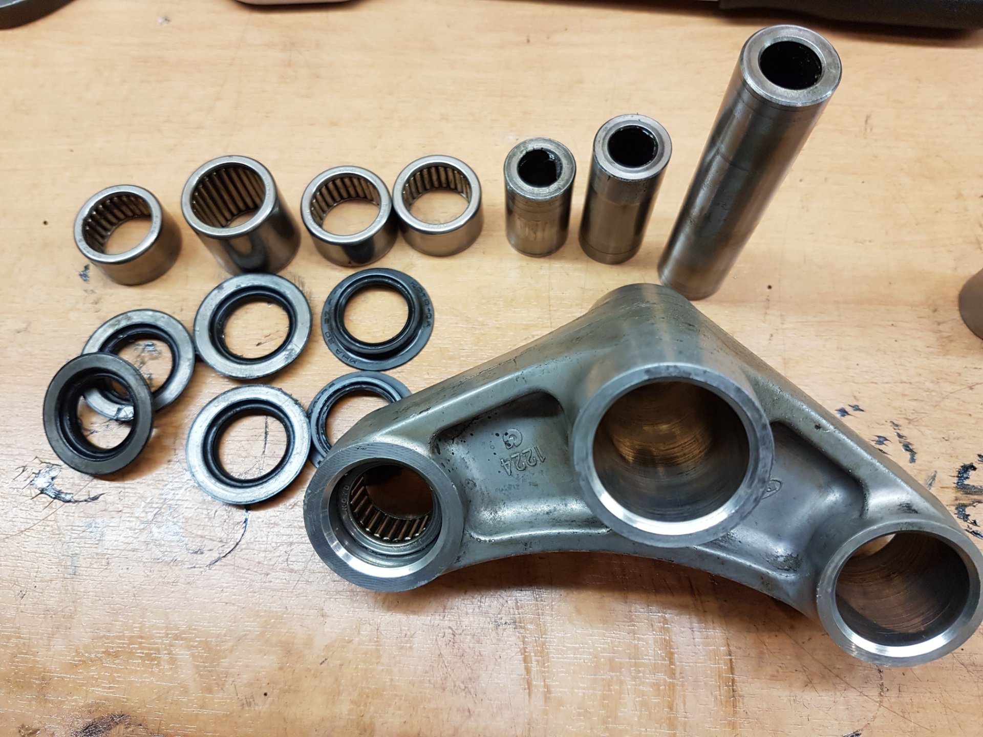 - Schwingenlager und Umlenkung kontrolliert, gefettet und 2 defekte Lager getauscht