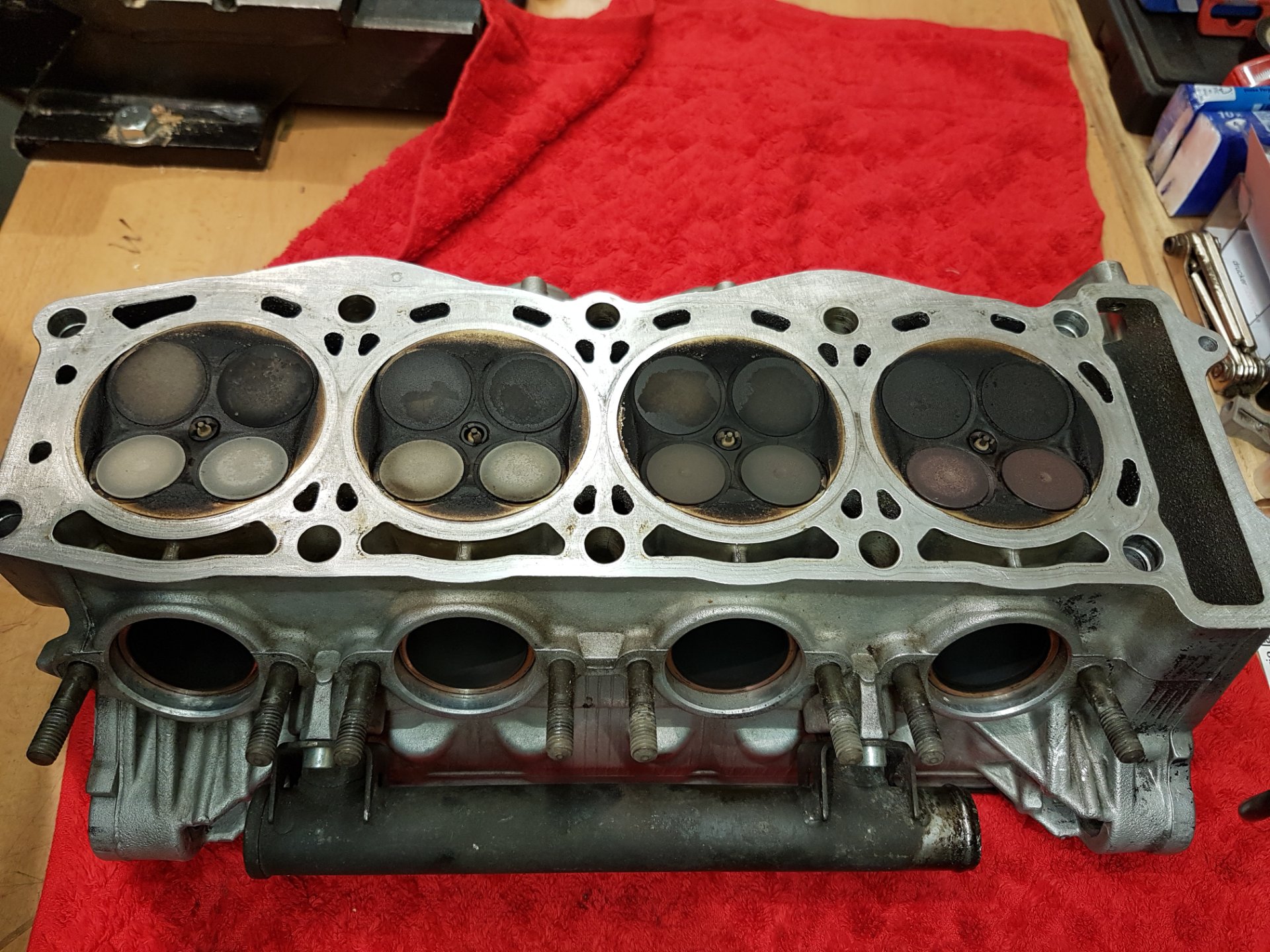 Eventuell bestand die Undichtigkeit schon seit Einbau des 9ér Motors. Das würde zumindest die dunkle Färbung im Krümmer dieses Zylinders erklären.