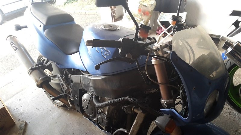 vor zwei Tagen haben Benny und ich uns spontan ein gemeinsames Wiederaufbauprojekt geangelt. Bei einem Händler im Nachbarort fanden wir eine blaue Jott in relativ verwahrlostem Zustand und konnten das arme Geschöpf dann nicht einfach seinem Schicksal überlassen... Gestern ist die Jott, getauft auf den Namen Erika, dann schon bei unseren beiden anderen ZXRen eingezogen. Das ganze gleicht eher einem Scheunenfund, da sie im Freien in einem überdachten Verschlag gestanden ist. Sie hat nun 72 000 km auf der Uhr und ist seit 8 Jahren stillgelegt. Kleine Vorwarnung - der wahre Zustand ist wesentlich übler als er auf den folgenden Bildern erscheint :oo: