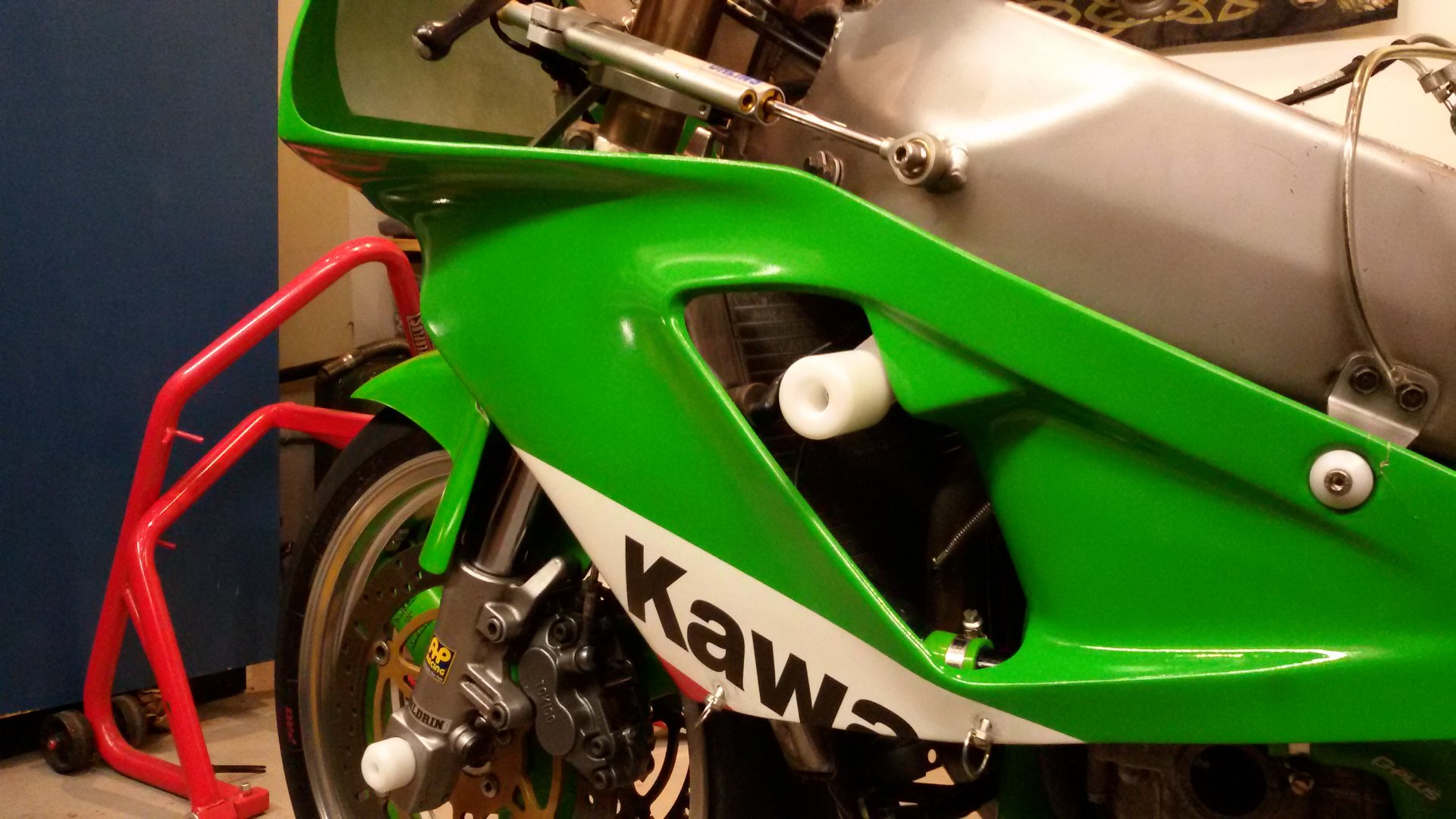 Hab mir ein paar Sturzpads gebaut und den alten Lenkungsdämpfer an der Gabelbrücke gegen einen wirksameren seitlichen getauscht.